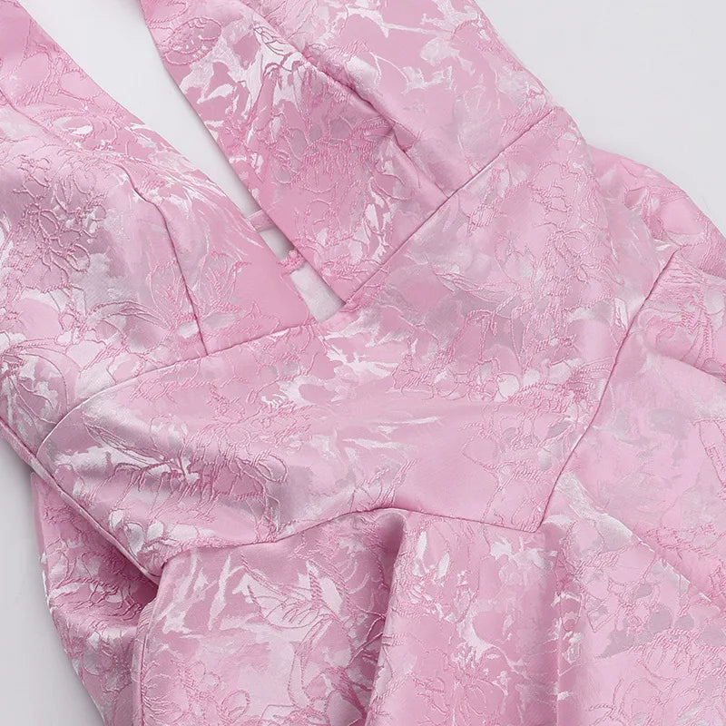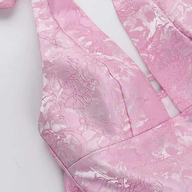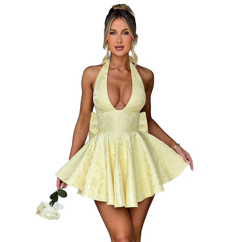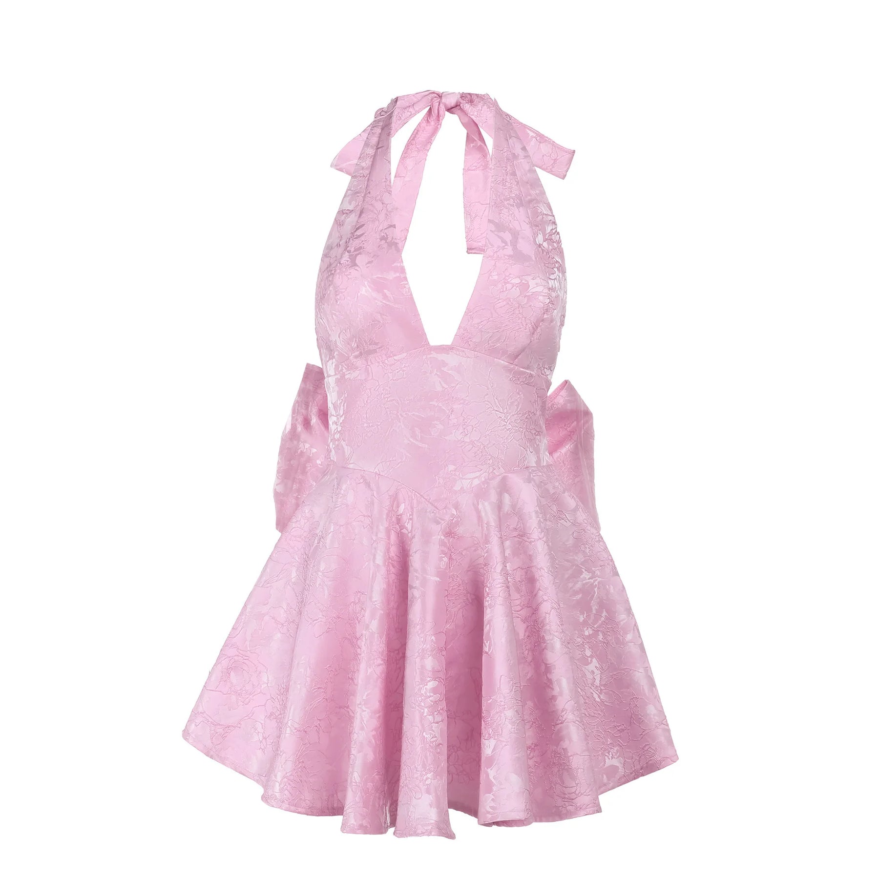 שמלת מיני רקמת איורי פרחים בגזרת A בעיטור פפיון בגב בעיצוב קשירה בגב להצמדה במותן וקשירה בצוואר - Pearl