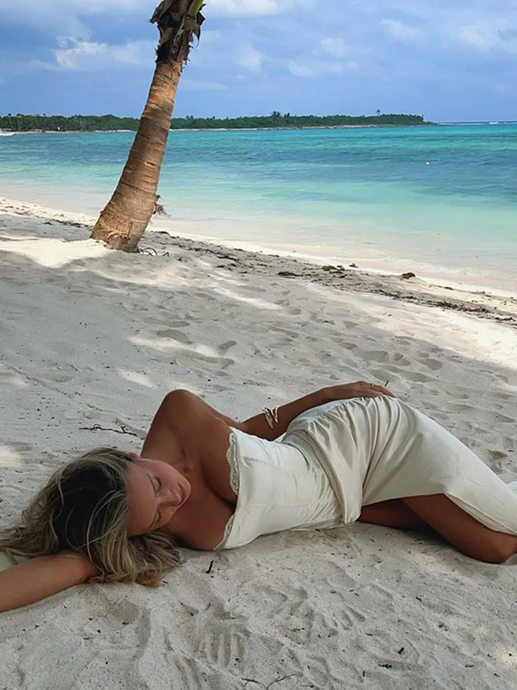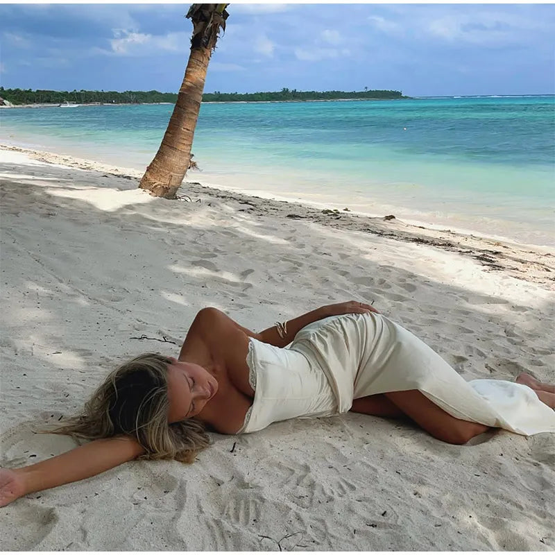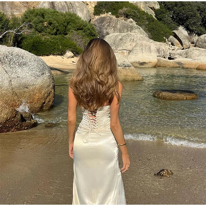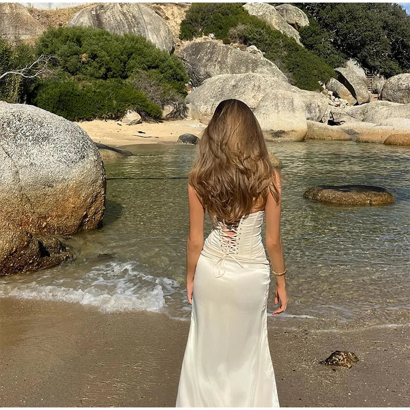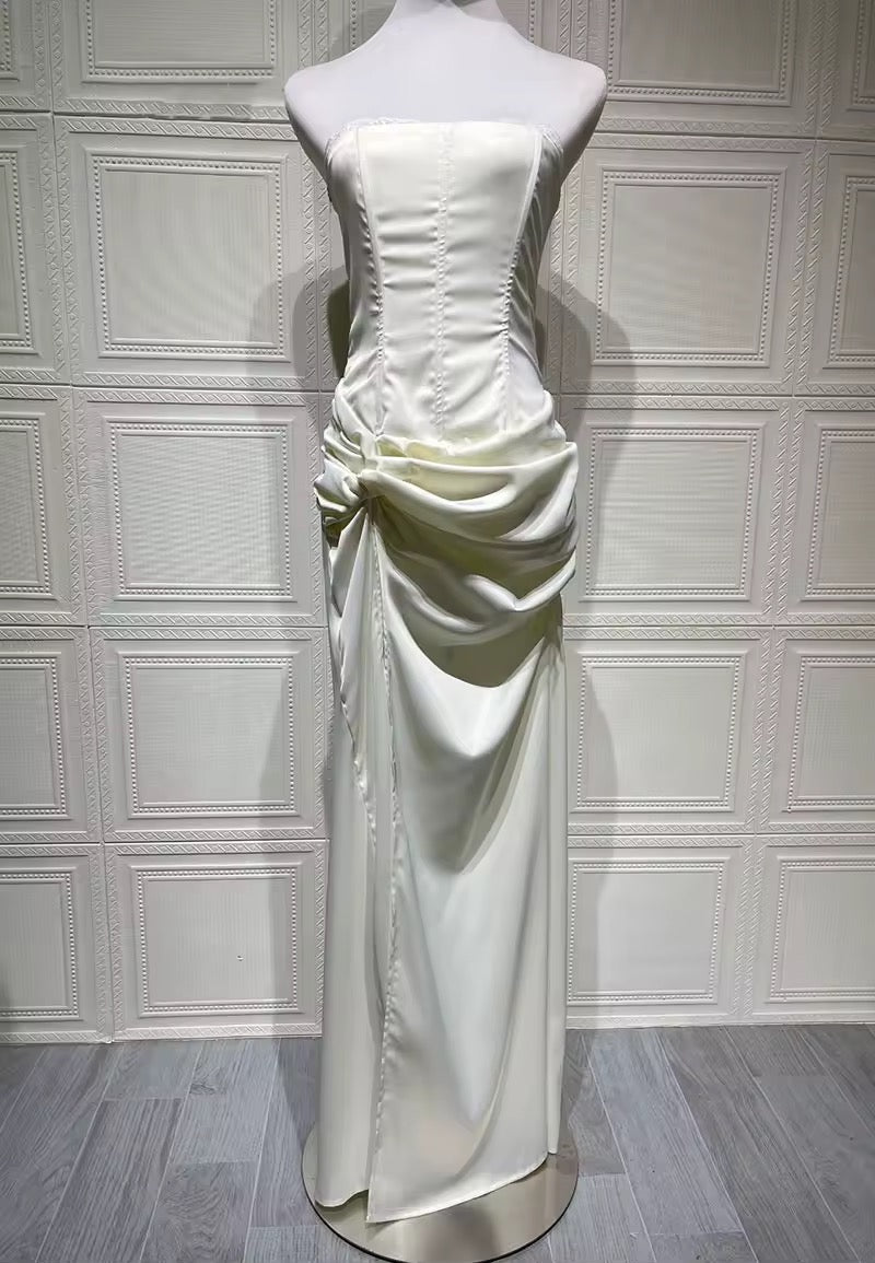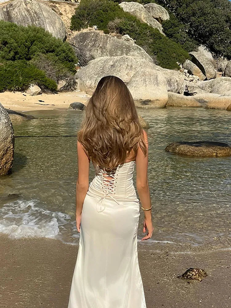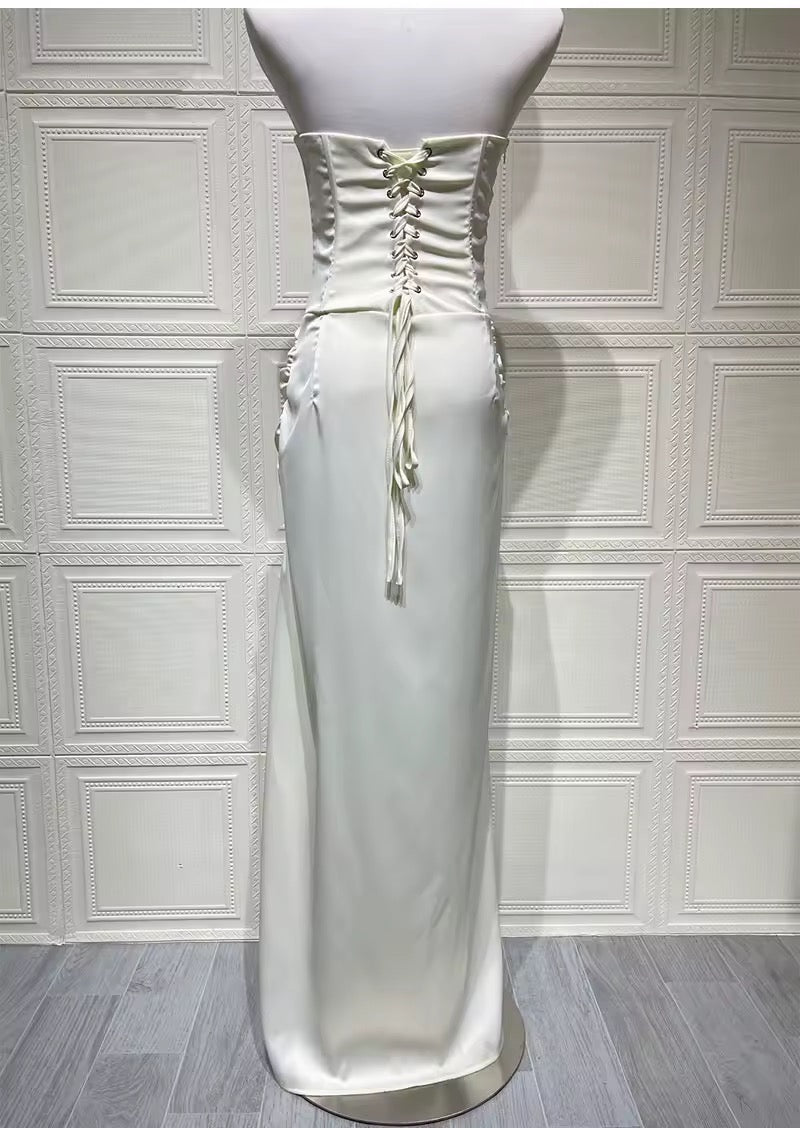 שמלת מקסי סטרפלס סאטן בעיצוב שסע וקשירה בגב להצמדה במותן בעיטור תחרה - מלאכי