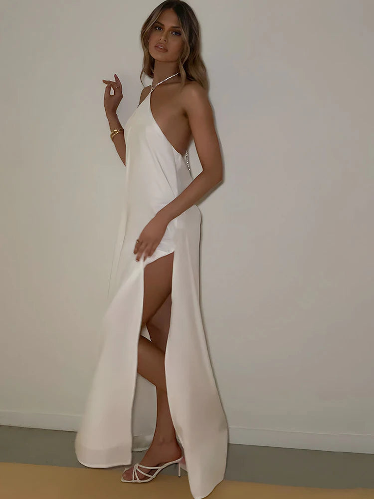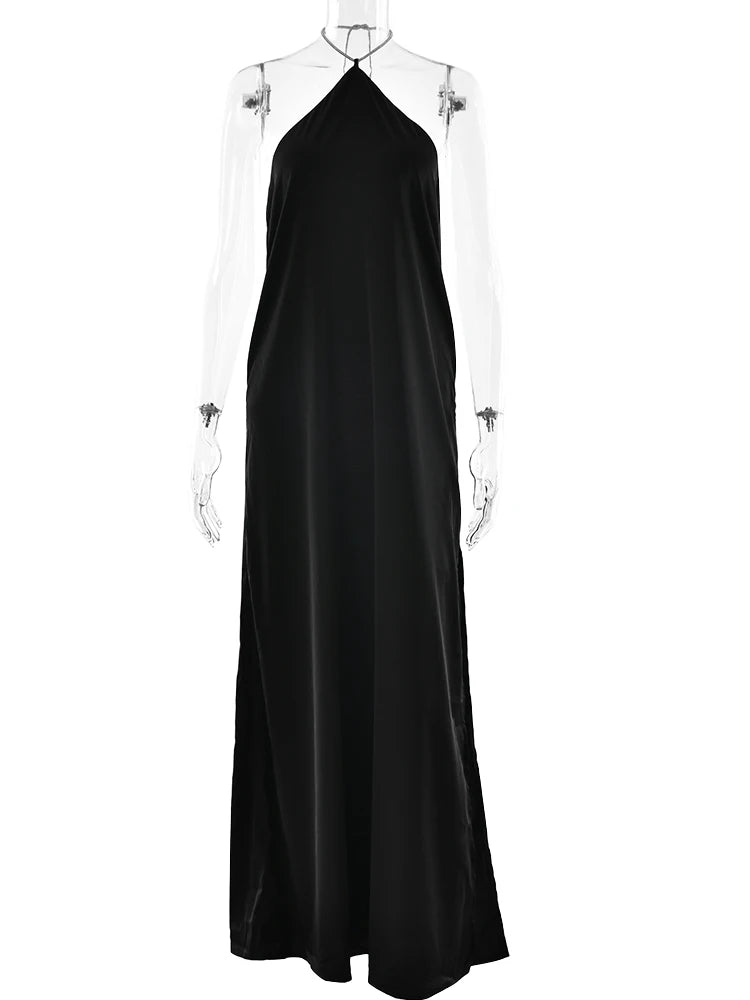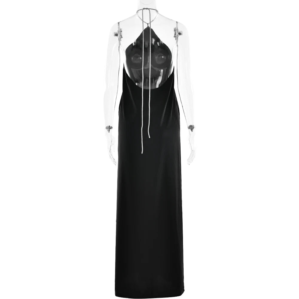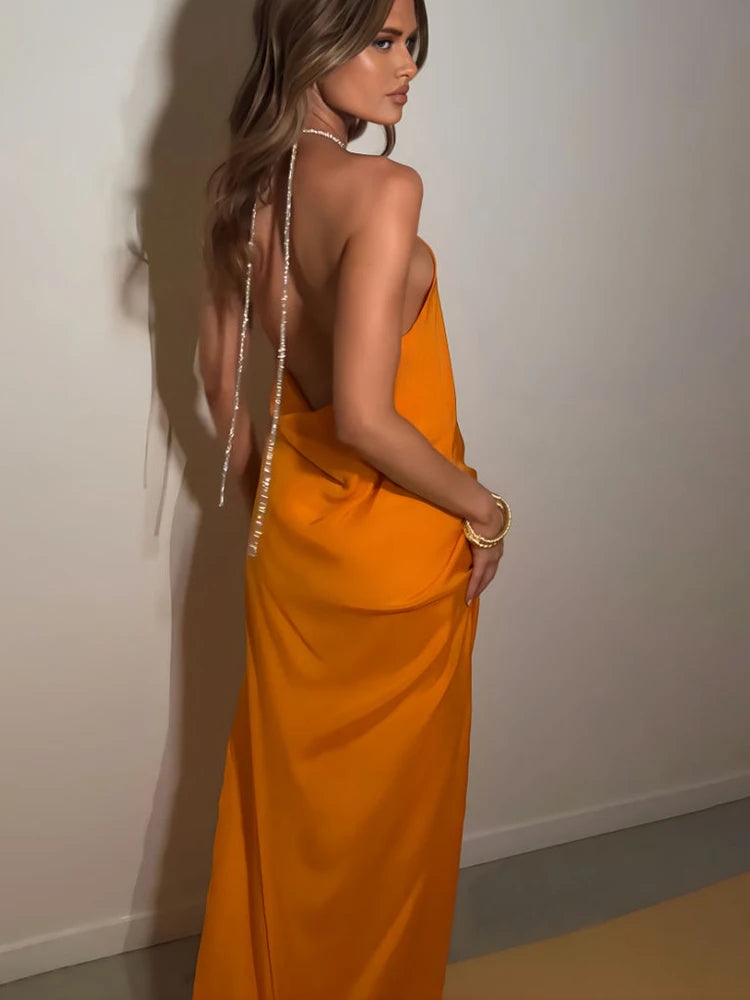 שמלת מקסי קולר סאטן גב פתוח בעיצוב זרקונים קשירה בעורף - נאיה