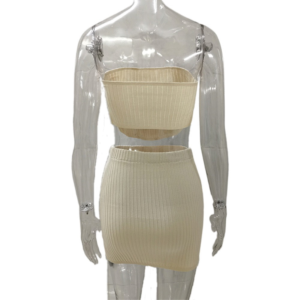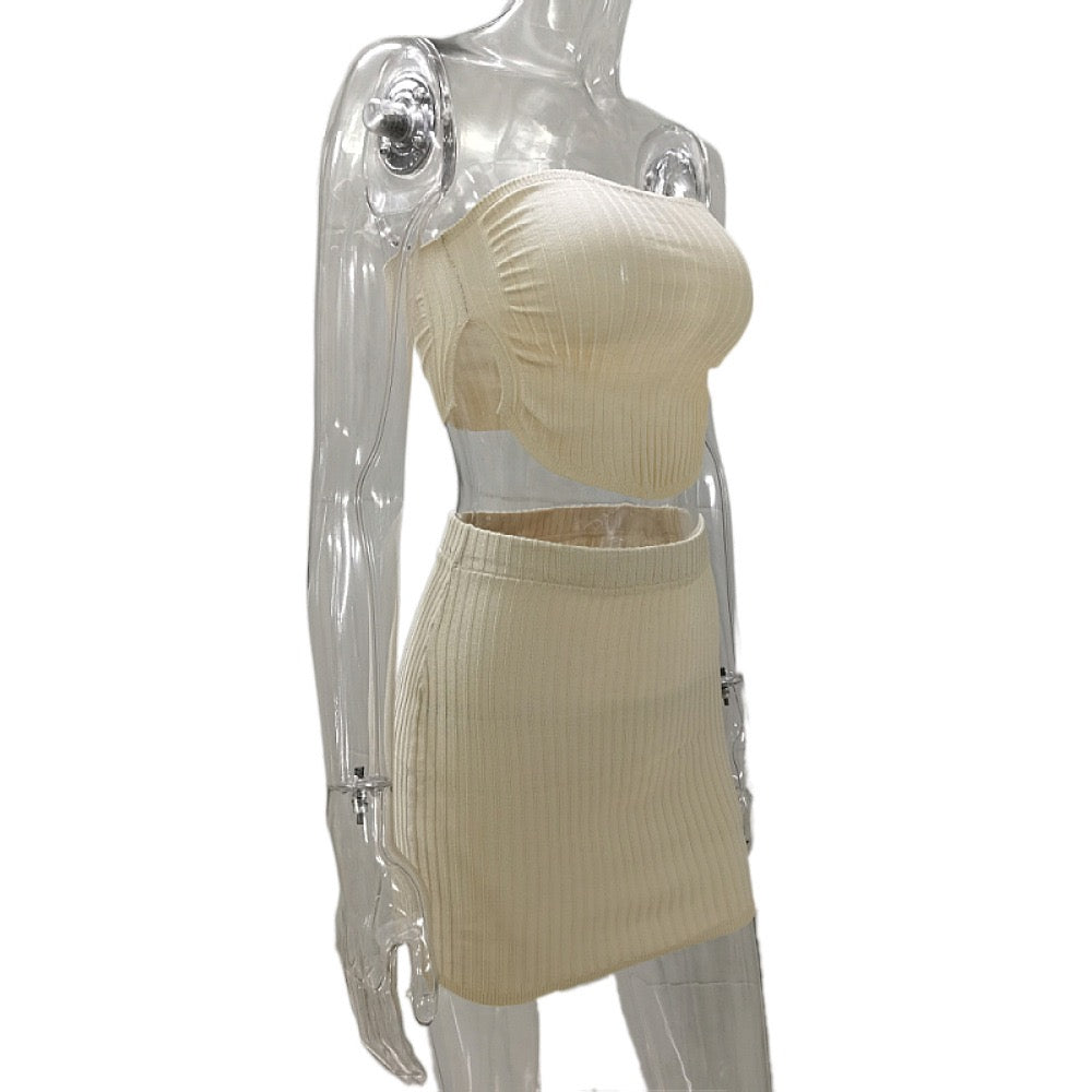 סט שני חלקים טופ סטרפלס וחצאית מיני בד מחטב - גיא