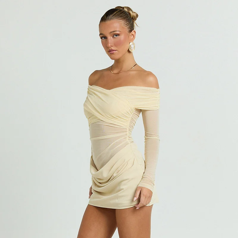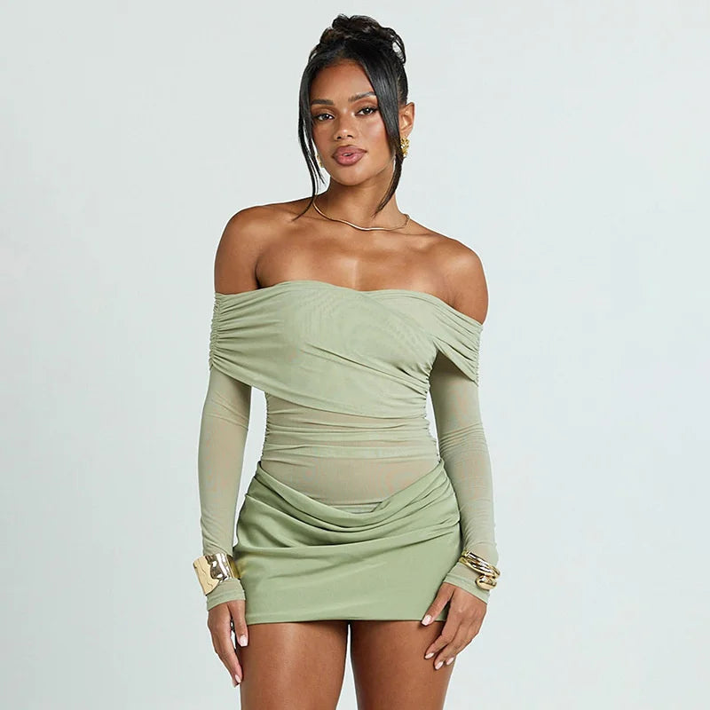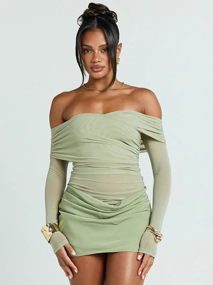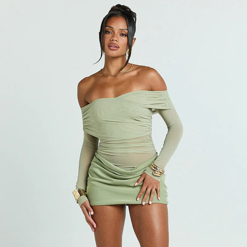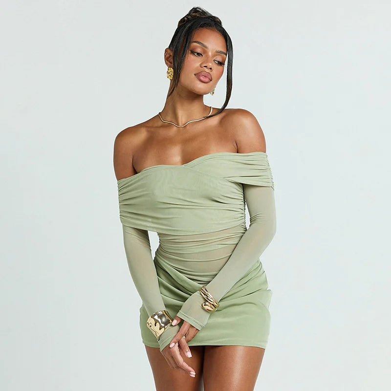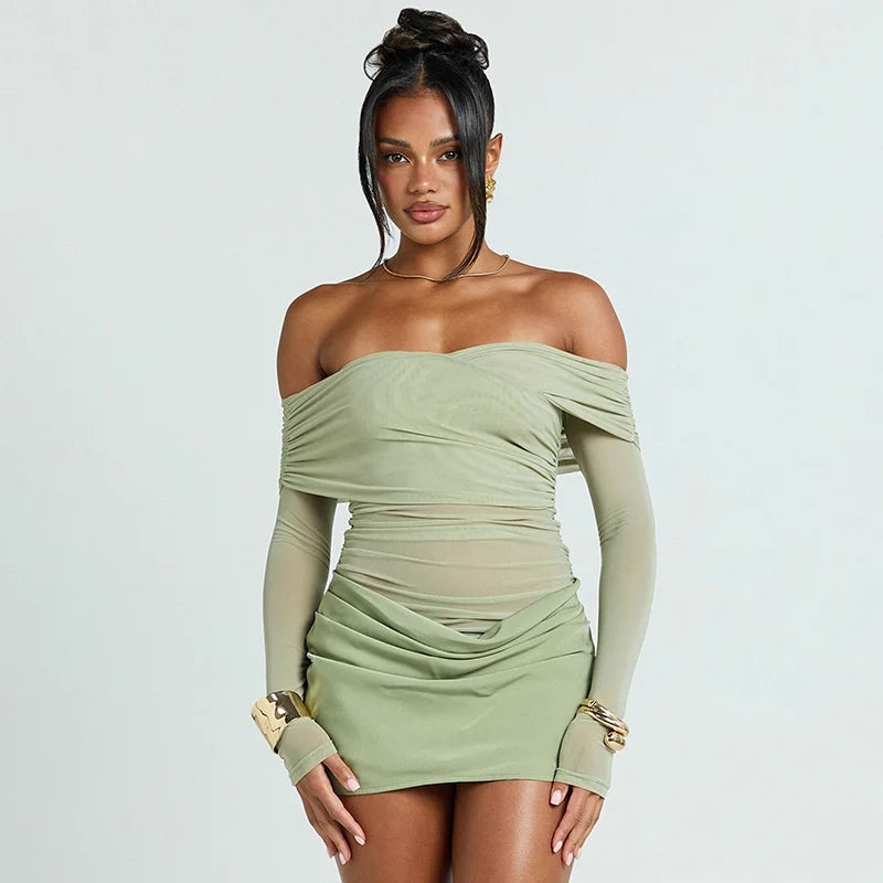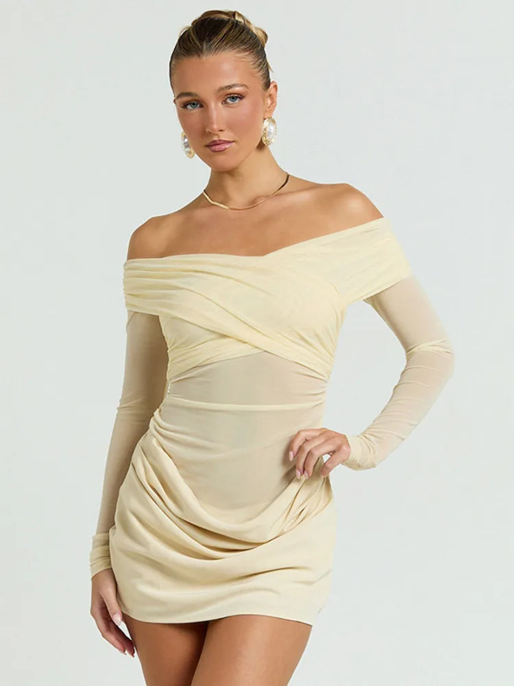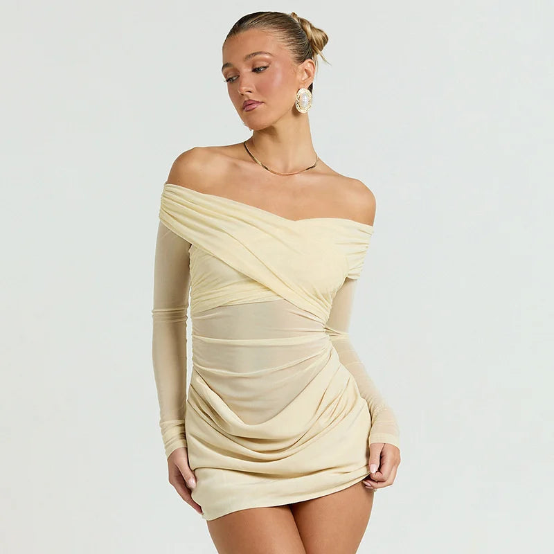 שמלת מיני כתפיים חשופות  בעיצוב קיפולים ורשת - אסיה