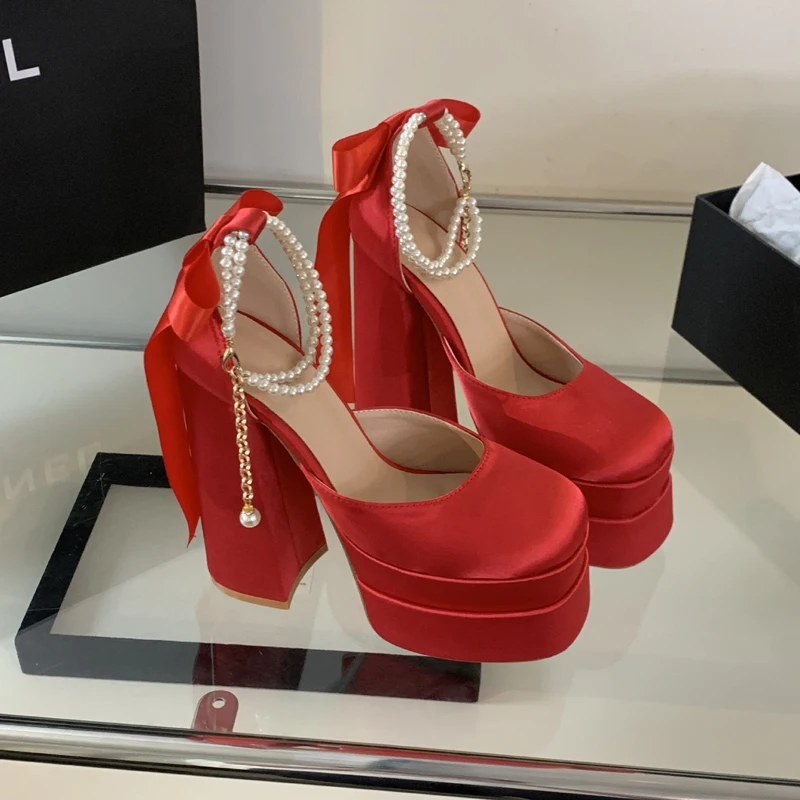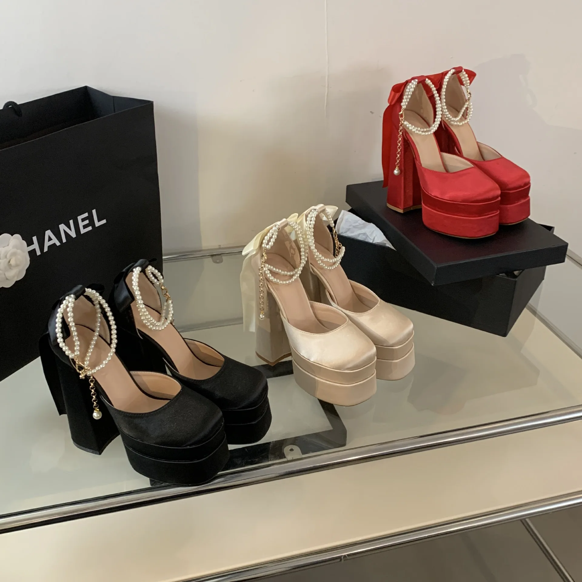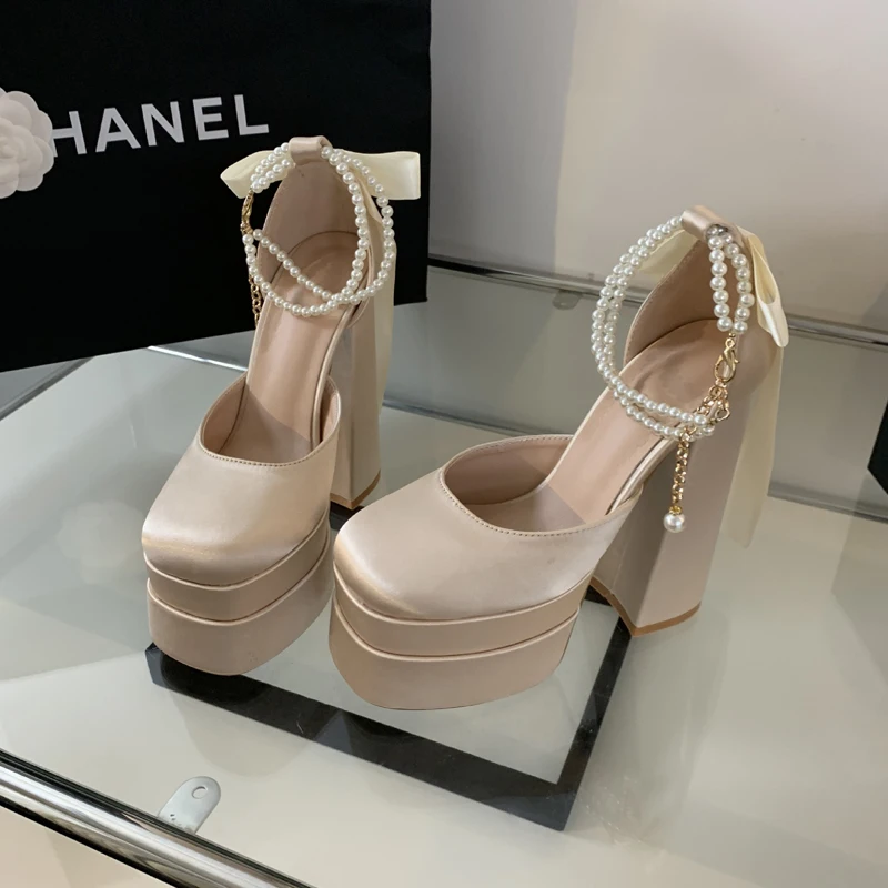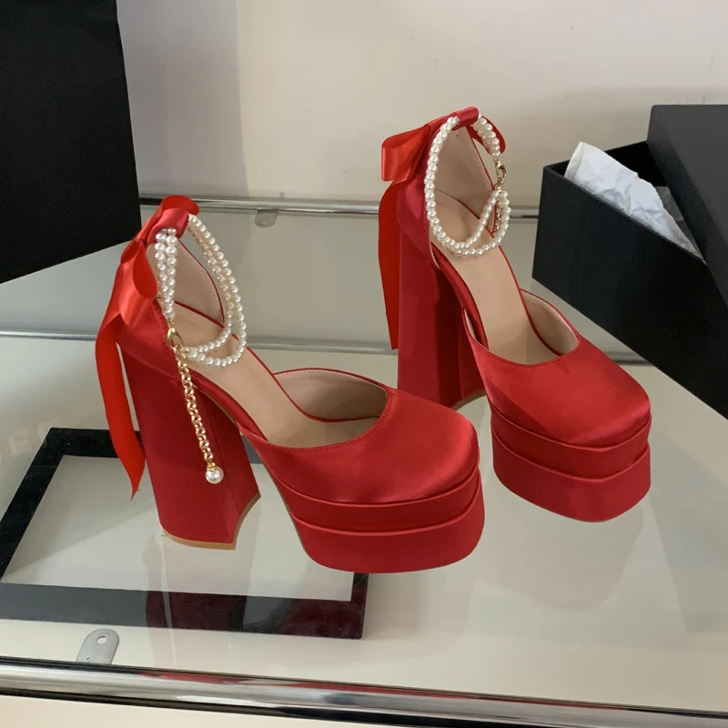 נעלי עקב משי סאטן בעיטור פנינים - קלי